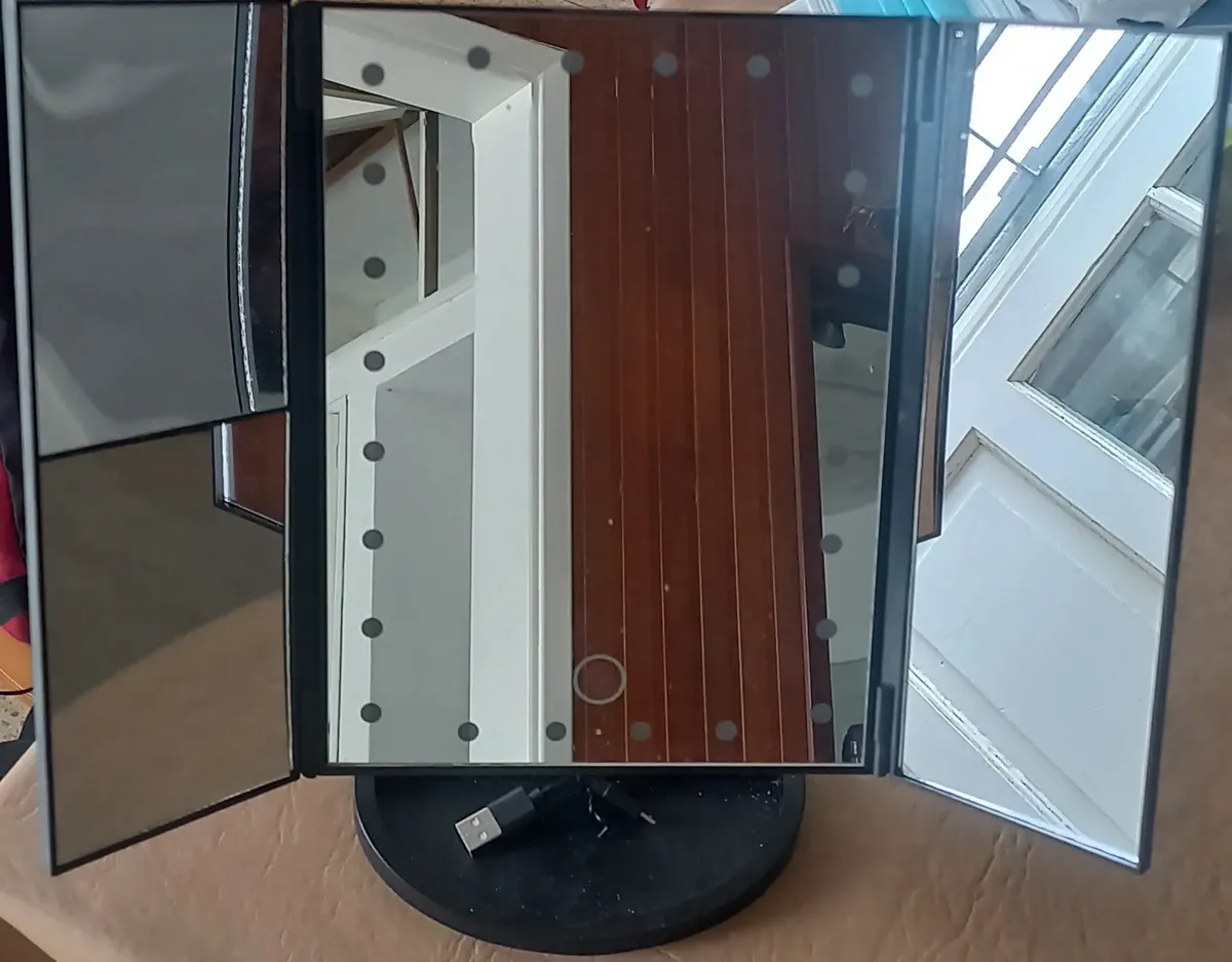 Espejo con luz LED integrada y diseño de tres paneles, ideal para maquillaje y cuidado personal. Fabricado en vidrio de alta calidad que brinda una imagen nítida y sin distorsión desde distintos ángulos. Su base estable permite un uso cómodo sobre cualquier superficie, mientras que los paneles laterales plegables facilitan un ajuste preciso para mayor visibilidad. Incluye espejo con aumento para detalles finos. Práctico, funcional y fácil de guardar, ideal para el uso diario en el hogar.